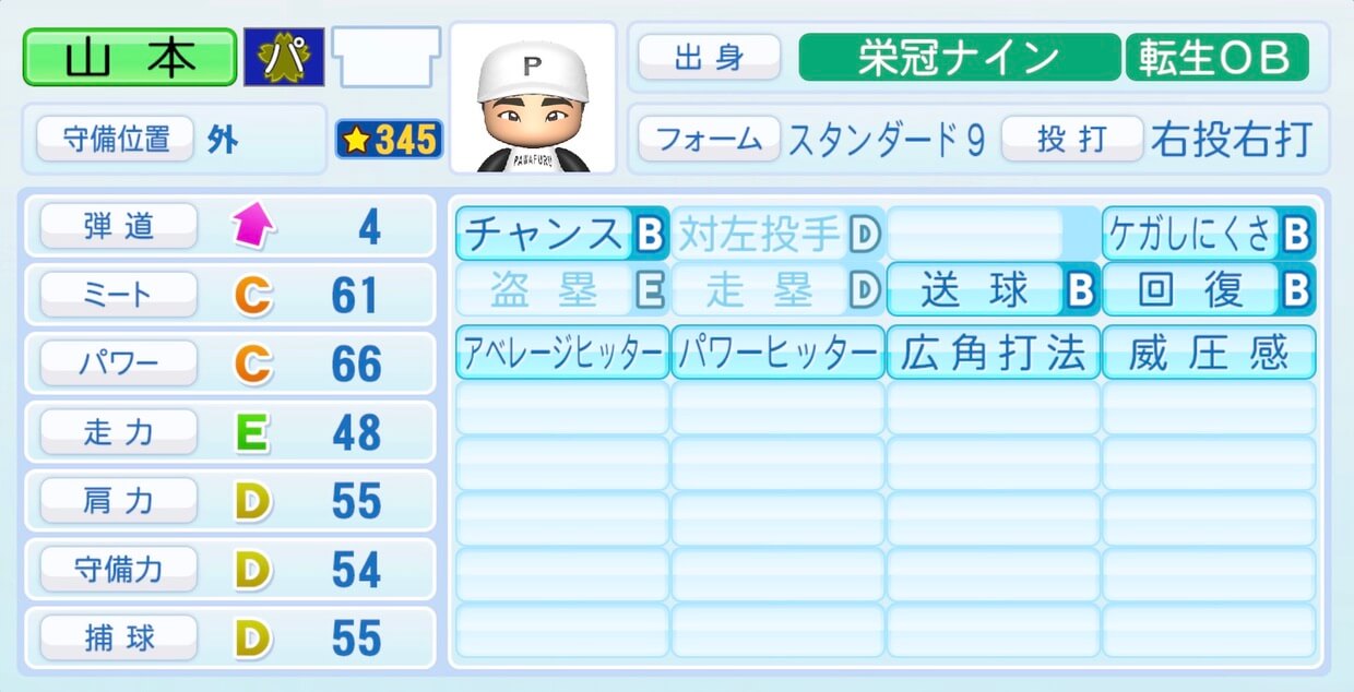 | 守備位置 | 弾道 | ミー | パワ | 走力 | 肩力 | 守備 | 捕球 |