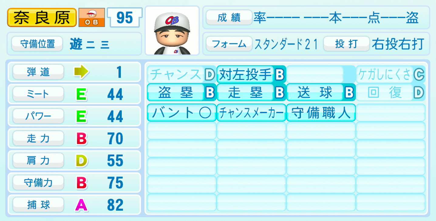 | 守備位置 | 弾道 | ミー | パワ | 走力 | 肩力 | 守備 | 捕球 |