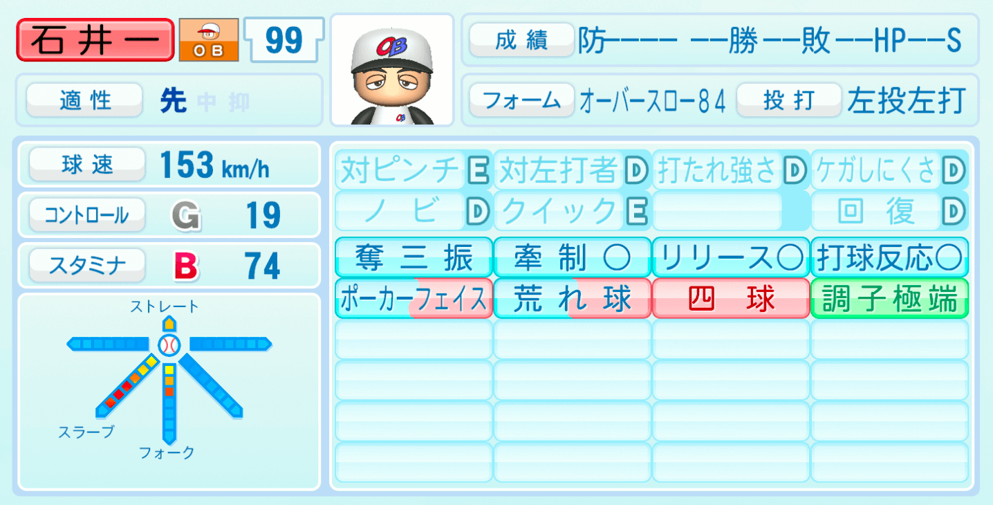 | 守備位置 | 弾道 | ミー | パワ | 走力 | 肩力 | 守備 | 捕球 |