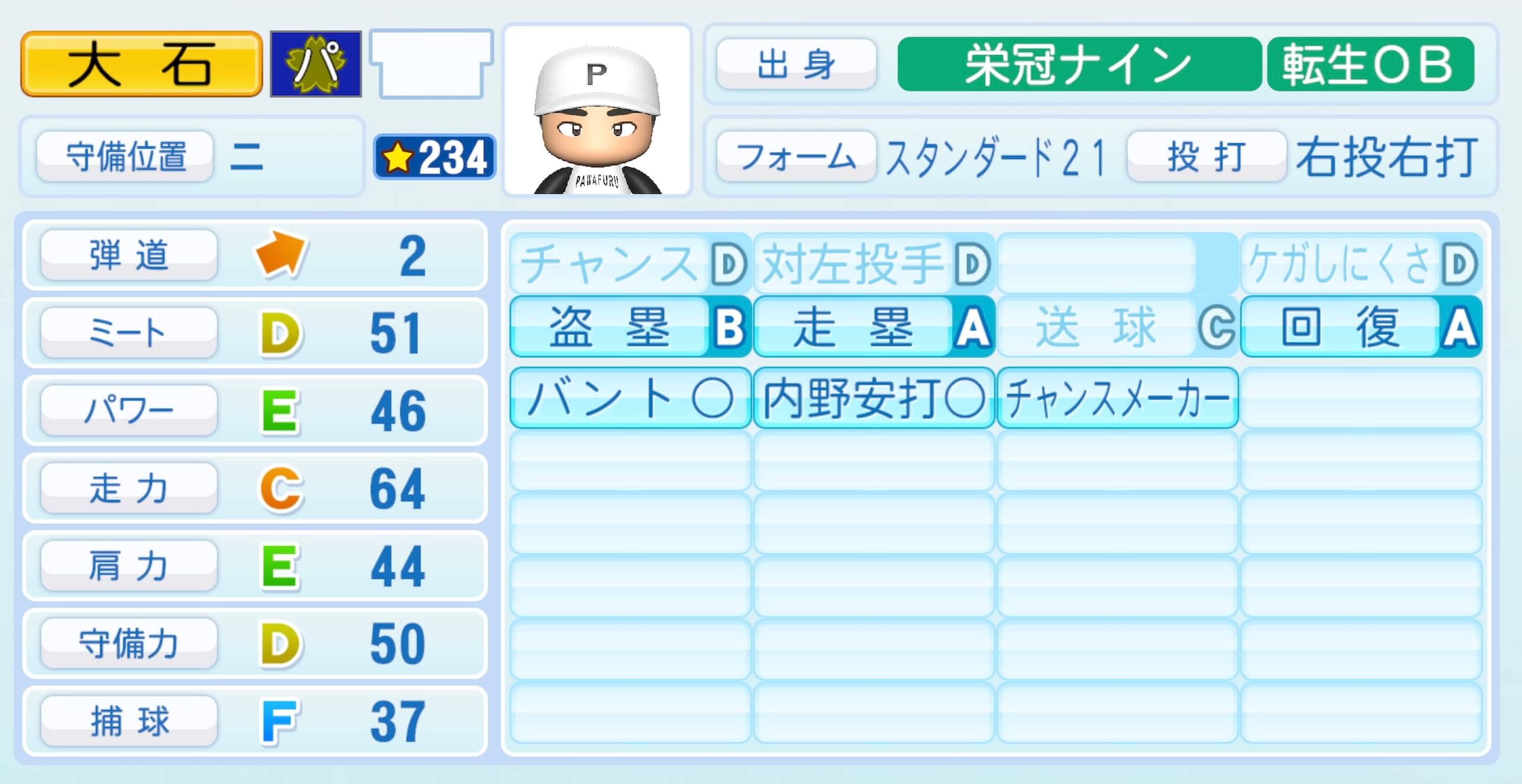 | 守備位置 | 弾道 | ミー | パワ | 走力 | 肩力 | 守備 | 捕球 |