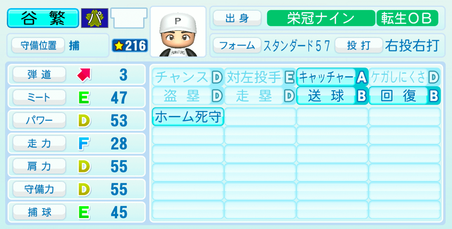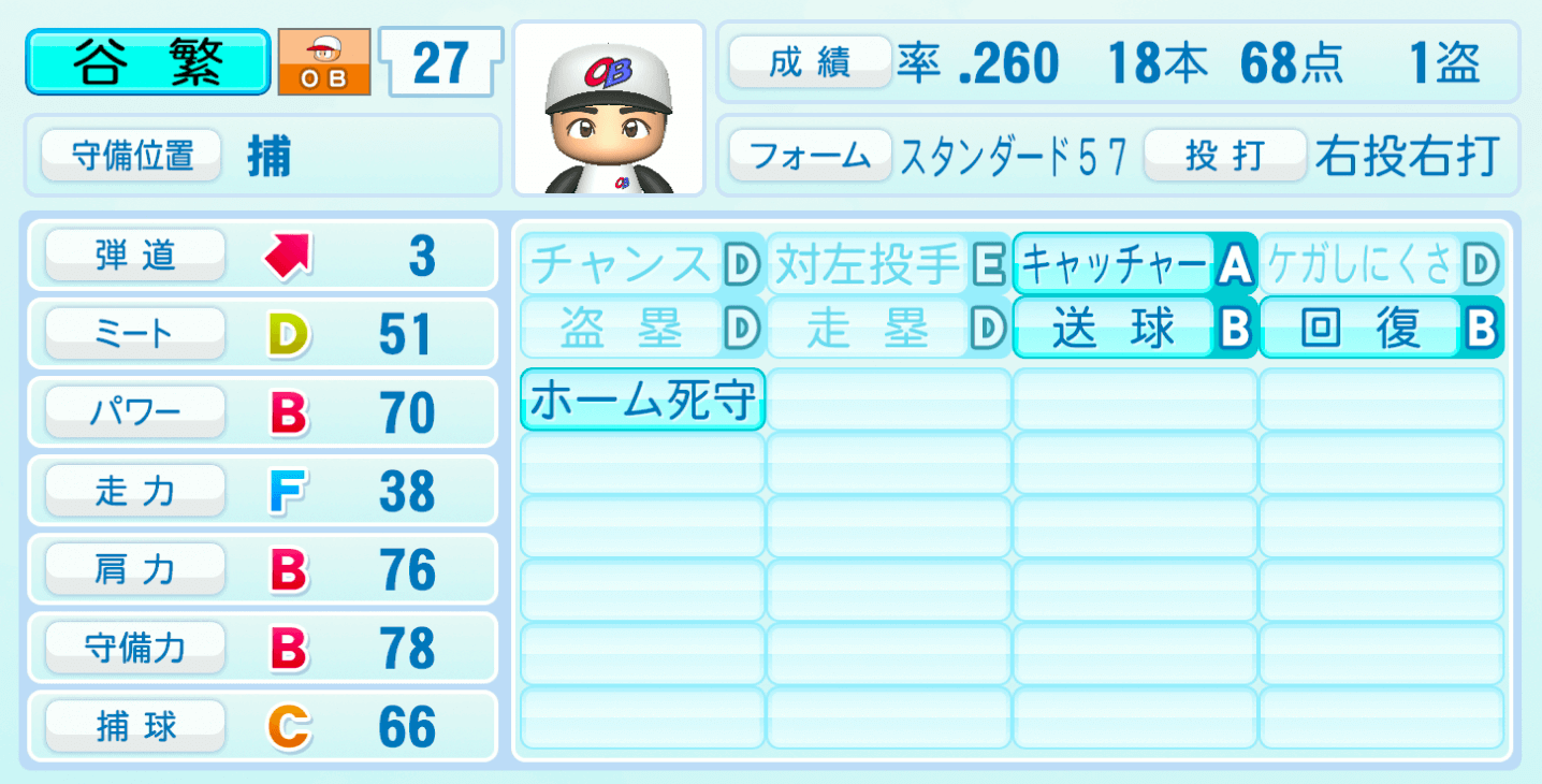 | 守備位置 | 弾道 | ミー | パワ | 走力 | 肩力 | 守備 | 捕球 |