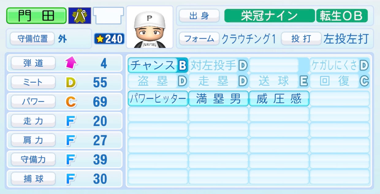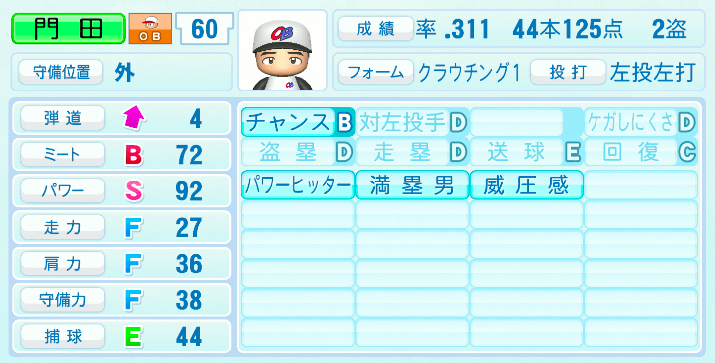 | 守備位置 | 弾道 | ミー | パワ | 走力 | 肩力 | 守備 | 捕球 |