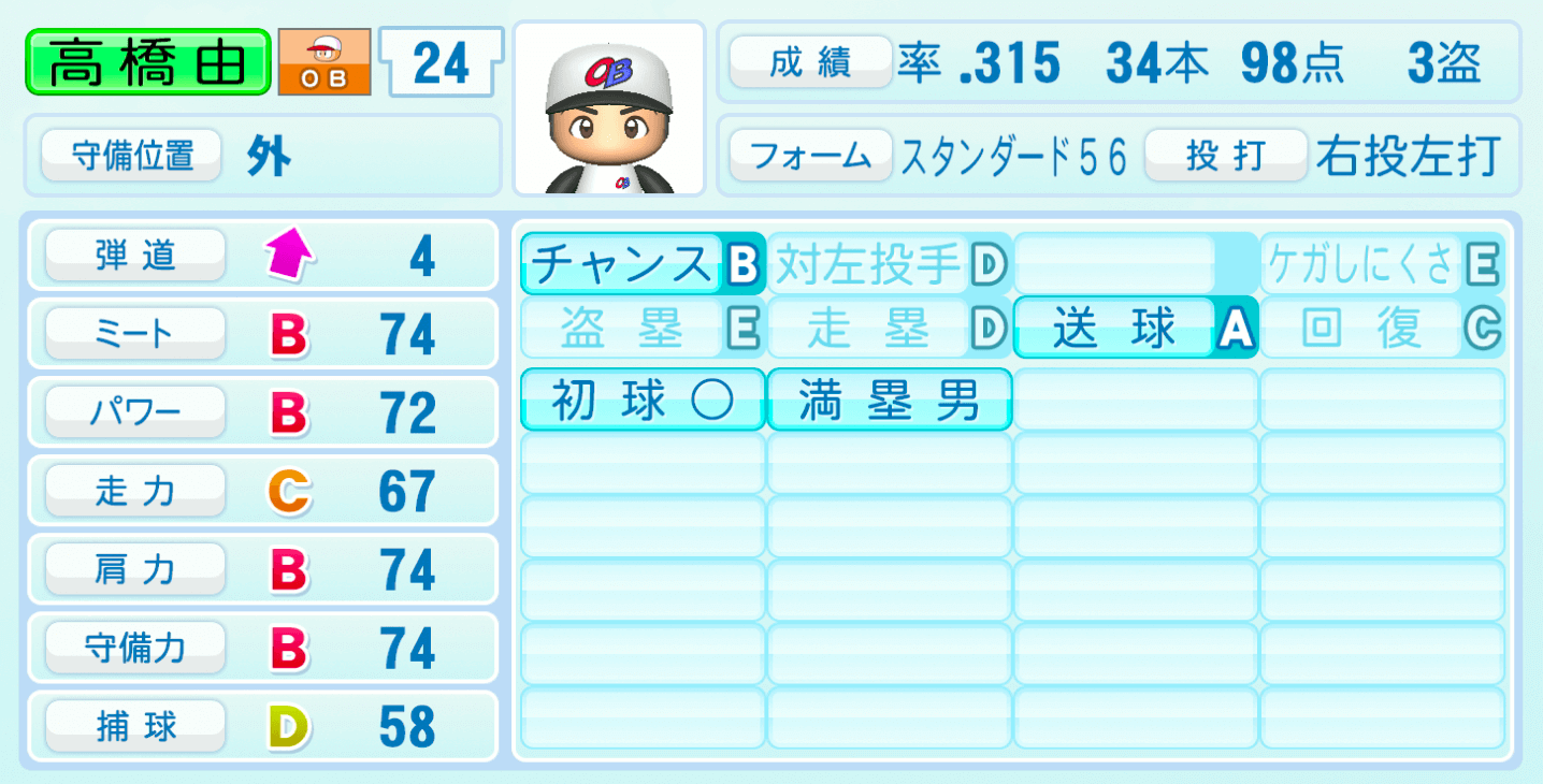 | 守備位置 | 弾道 | ミー | パワ | 走力 | 肩力 | 守備 | 捕球 |