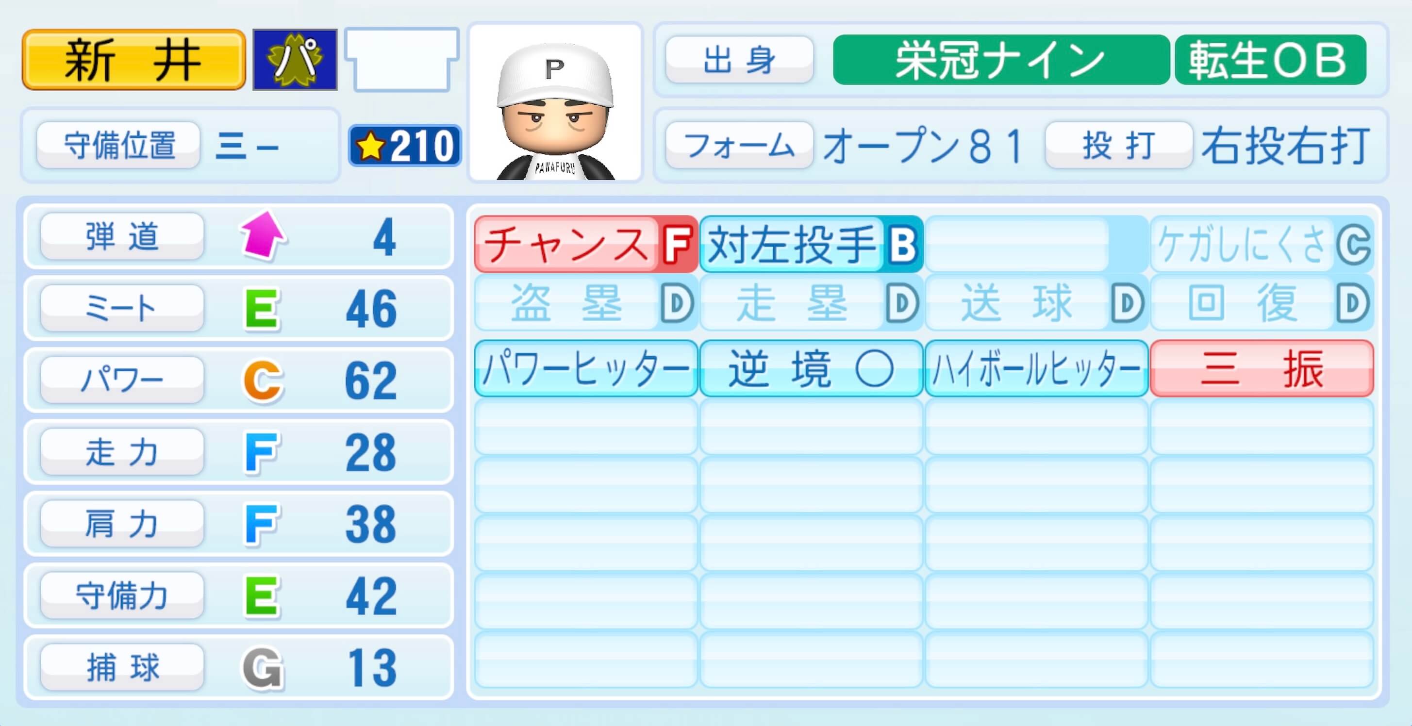 | 守備位置 | 弾道 | ミー | パワ | 走力 | 肩力 | 守備 | 捕球 |