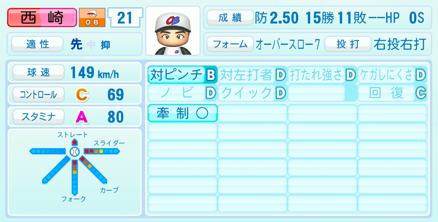 | 適性 | 先/抑 | 球速 | 149km/h |