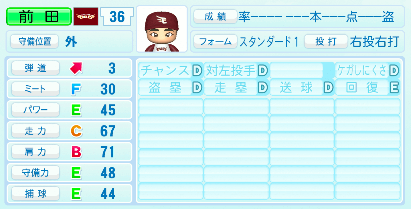 | 守備位置 | 弾道 | ミー | パワ | 走力 | 肩力 | 守備 | 捕球 |
