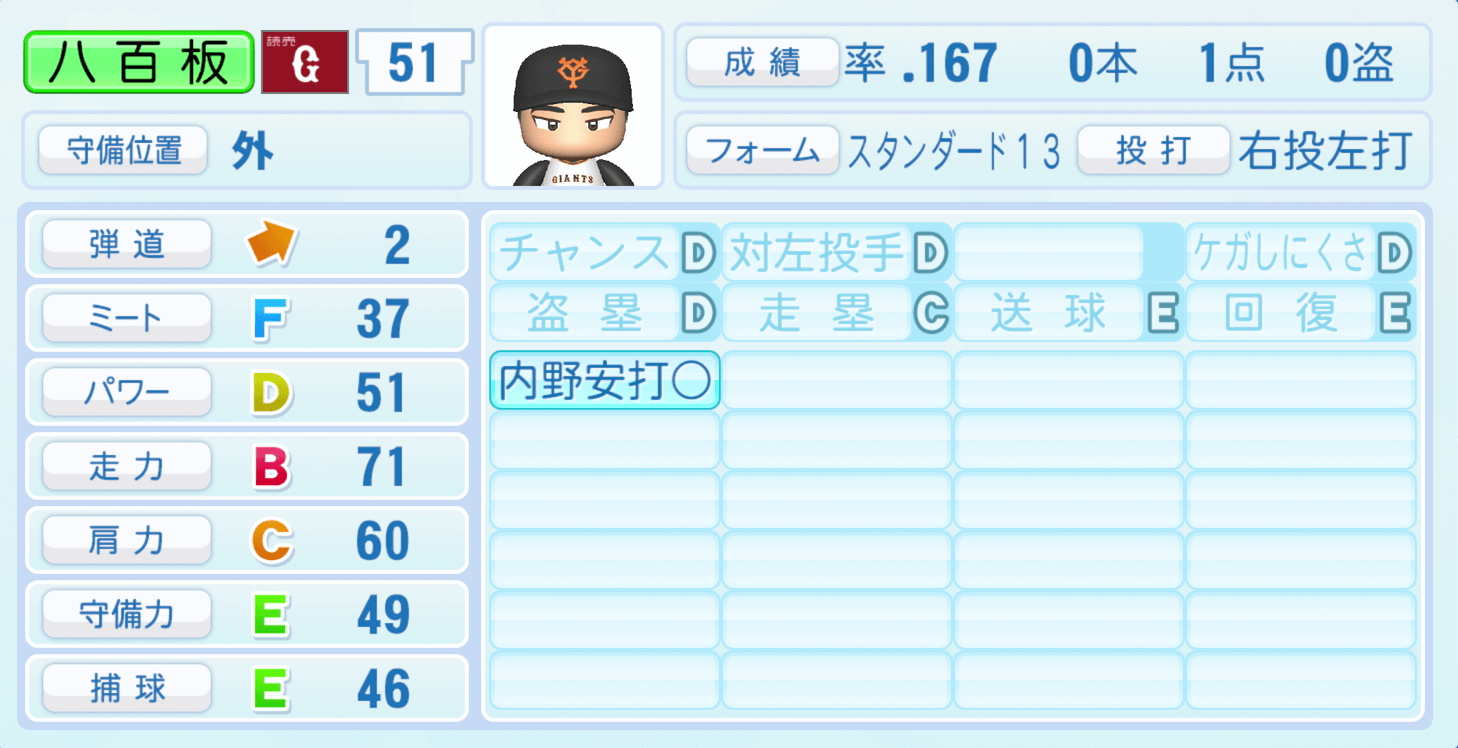 | 守備位置 | 弾道 | ミー | パワ | 走力 | 肩力 | 守備 | 捕球 |