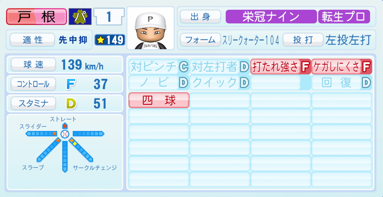 | 守備位置 | 弾道 | ミー | パワ | 走力 | 肩力 | 守備 | 捕球 |