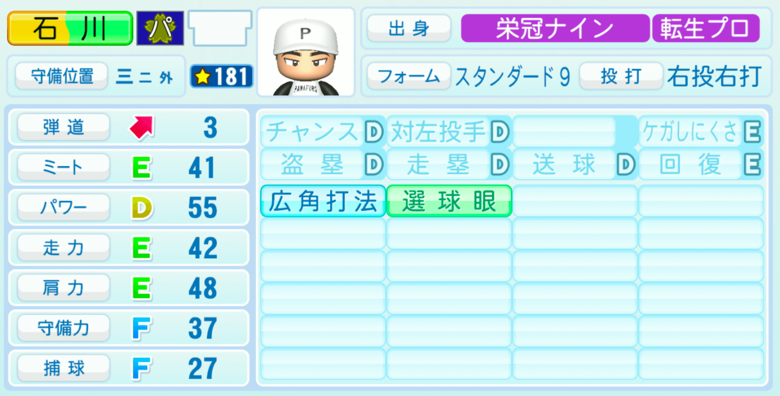 | 守備位置 | 弾道 | ミー | パワ | 走力 | 肩力 | 守備 | 捕球 |