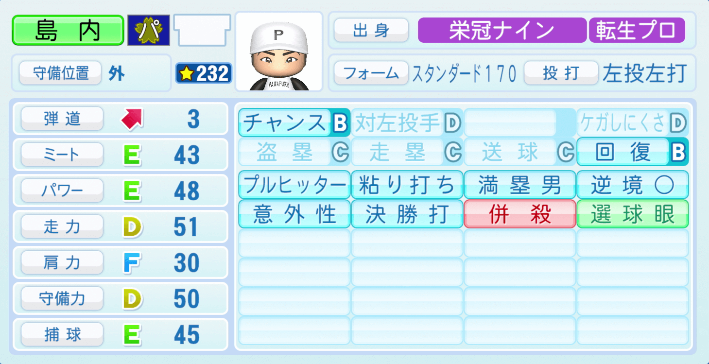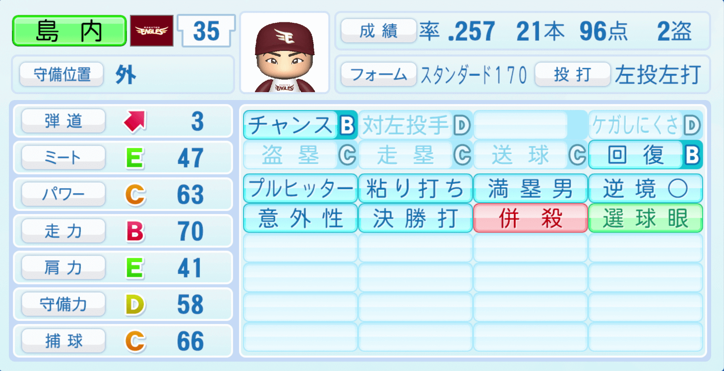 | 守備位置 | 弾道 | ミー | パワ | 走力 | 肩力 | 守備 | 捕球 |