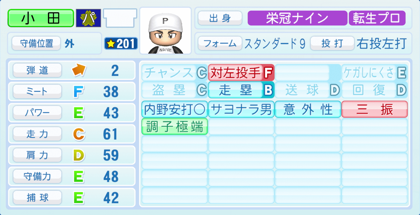 | 守備位置 | 弾道 | ミー | パワ | 走力 | 肩力 | 守備 | 捕球 |