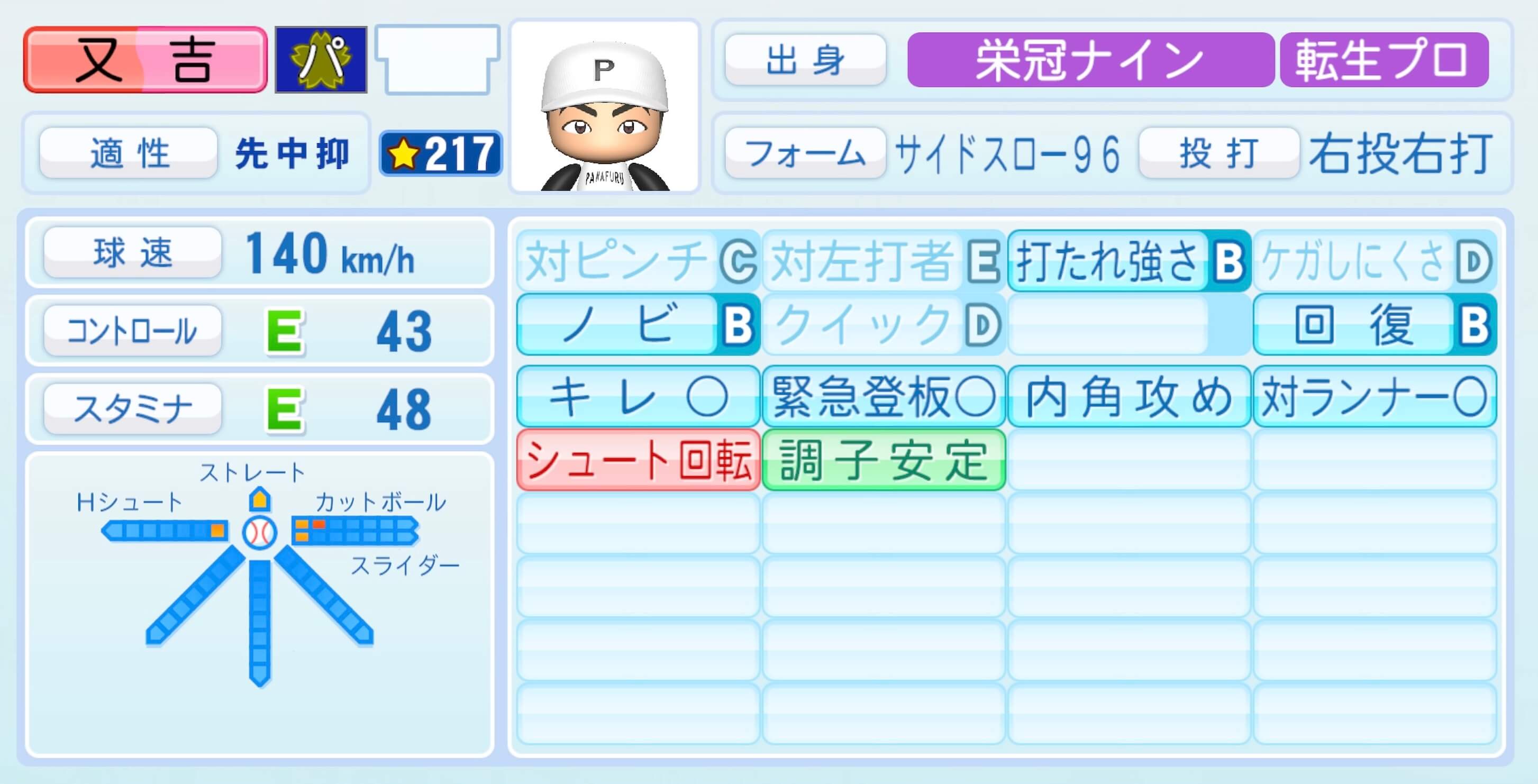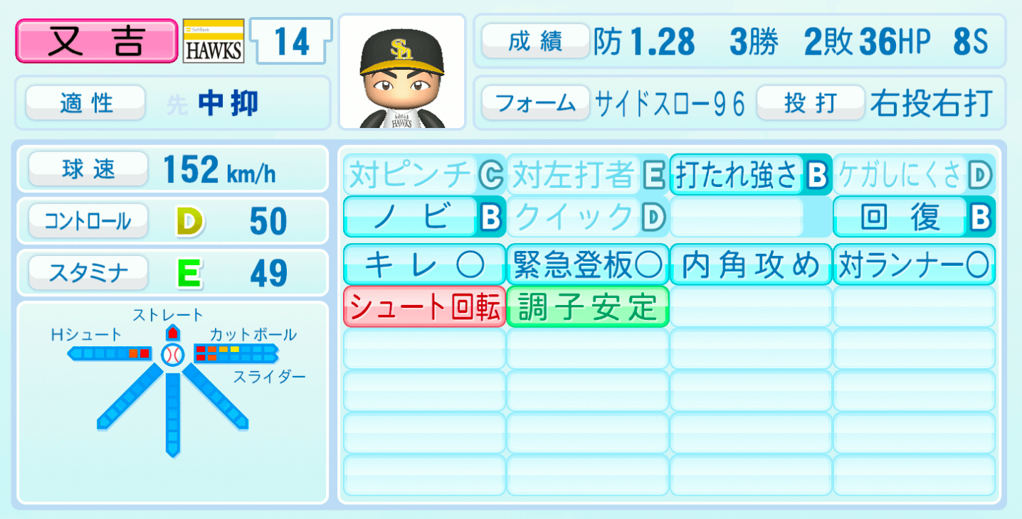 | 適性 | 中抑/- | 球速 | 152km/h |