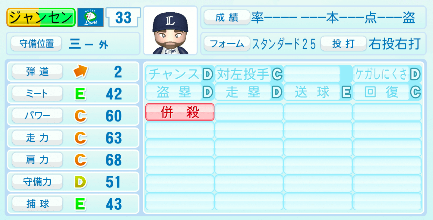 | 守備位置 | 弾道 | ミー | パワ | 走力 | 肩力 | 守備 | 捕球 |