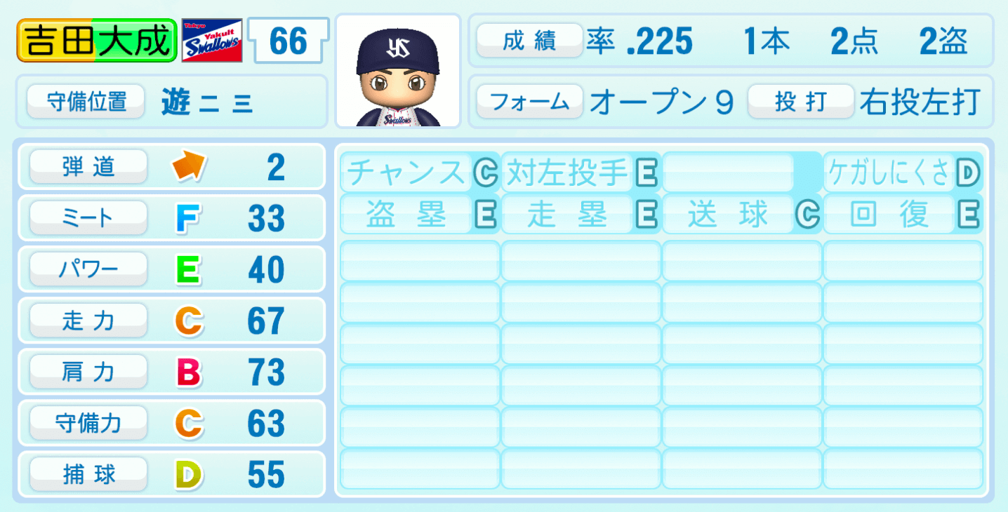 | 守備位置 | 弾道 | ミー | パワ | 走力 | 肩力 | 守備 | 捕球 |