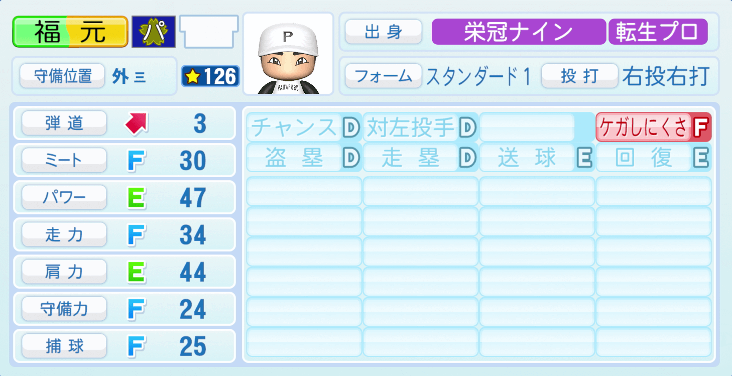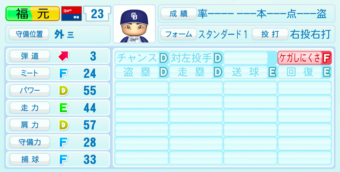 | 守備位置 | 弾道 | ミー | パワ | 走力 | 肩力 | 守備 | 捕球 |