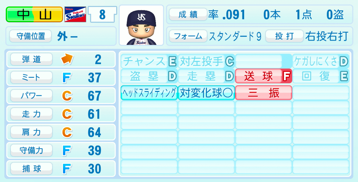 | 守備位置 | 弾道 | ミー | パワ | 走力 | 肩力 | 守備 | 捕球 |