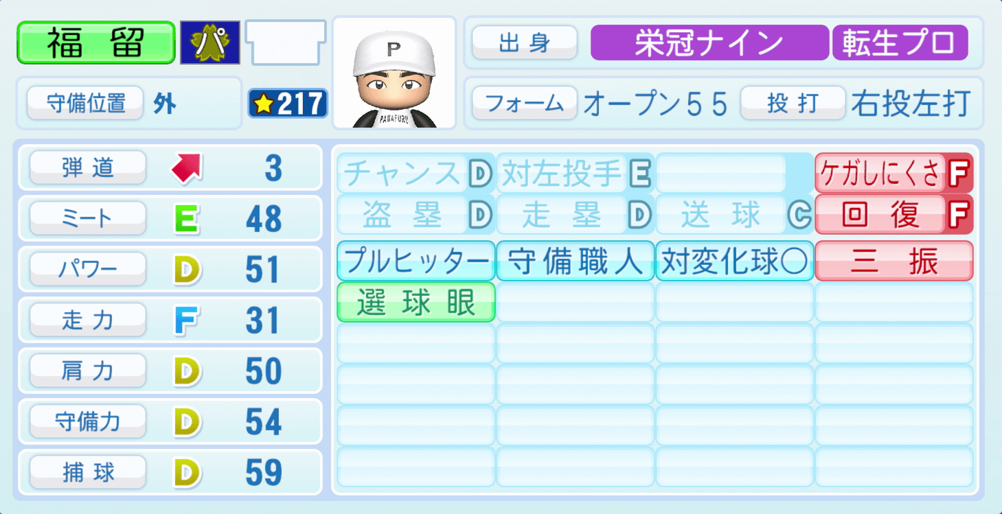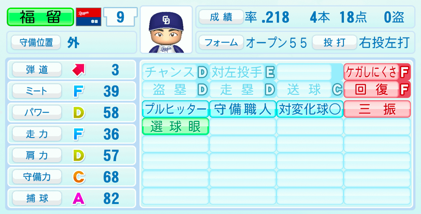 | 守備位置 | 弾道 | ミー | パワ | 走力 | 肩力 | 守備 | 捕球 |