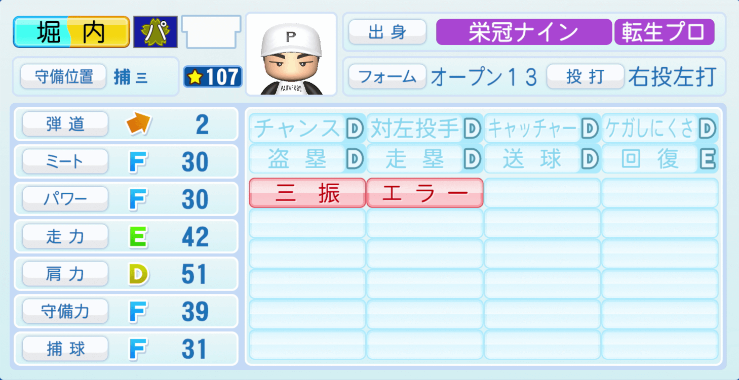 | 守備位置 | 弾道 | ミー | パワ | 走力 | 肩力 | 守備 | 捕球 |