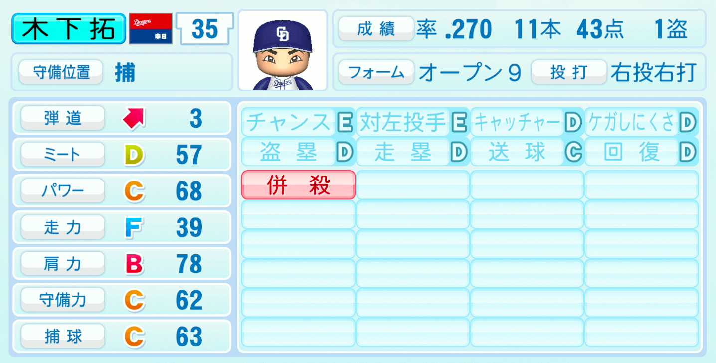 【パワプロ2022】木下拓哉の選手・特殊能力と転生情報|中日