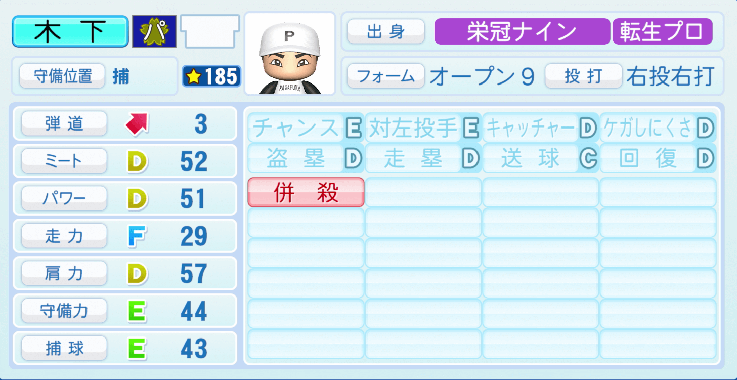 | 守備位置 | 弾道 | ミー | パワ | 走力 | 肩力 | 守備 | 捕球 |