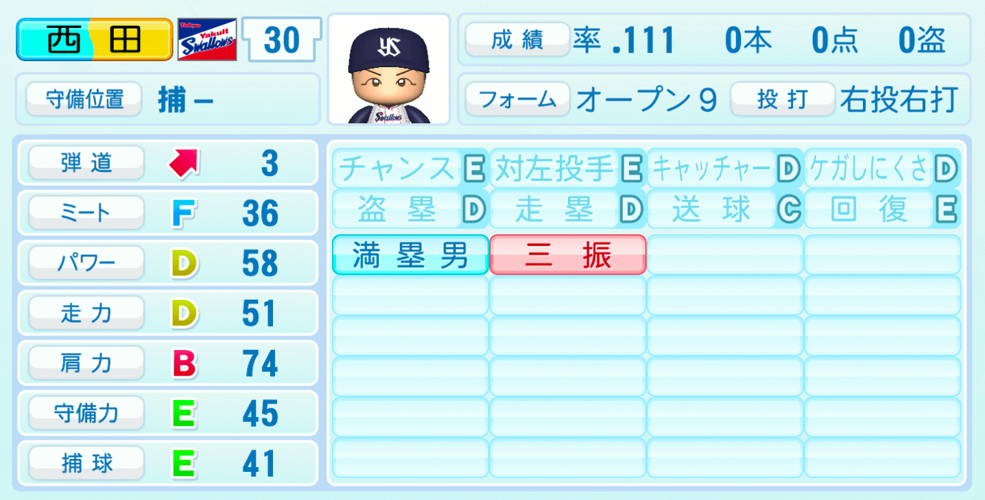 | 守備位置 | 弾道 | ミー | パワ | 走力 | 肩力 | 守備 | 捕球 |