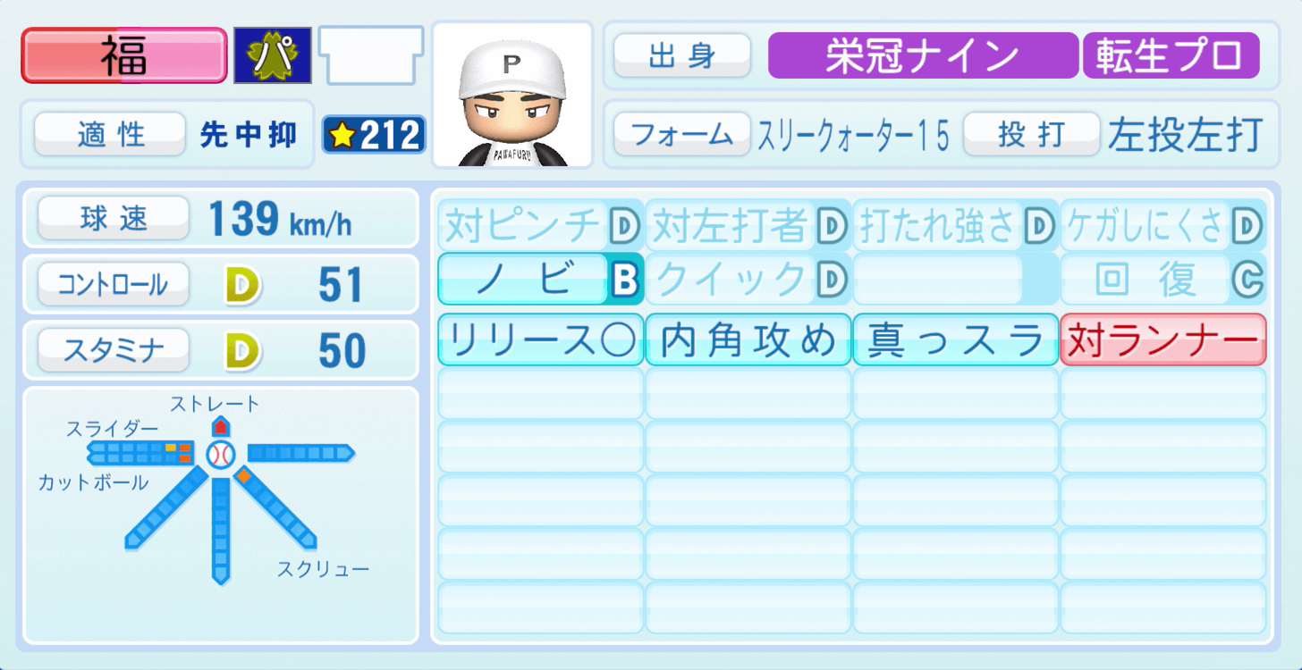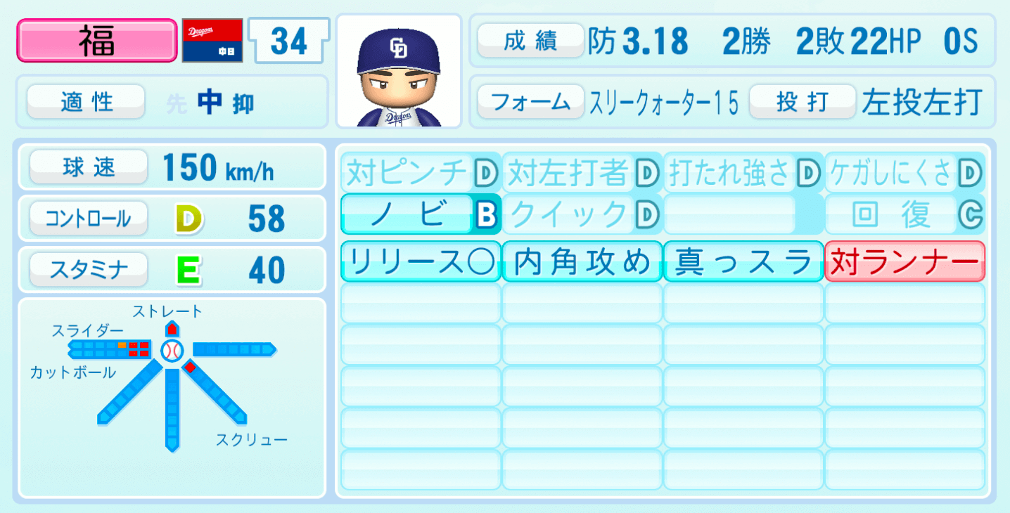 | 適性 | 中/抑 | 球速 | 150km/h |