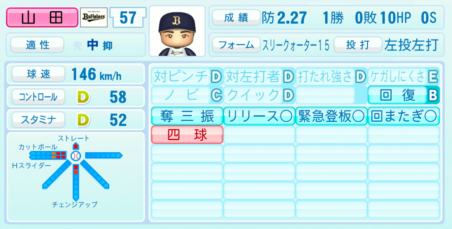 | 適性 | 中/抑 | 球速 | 146km/h |