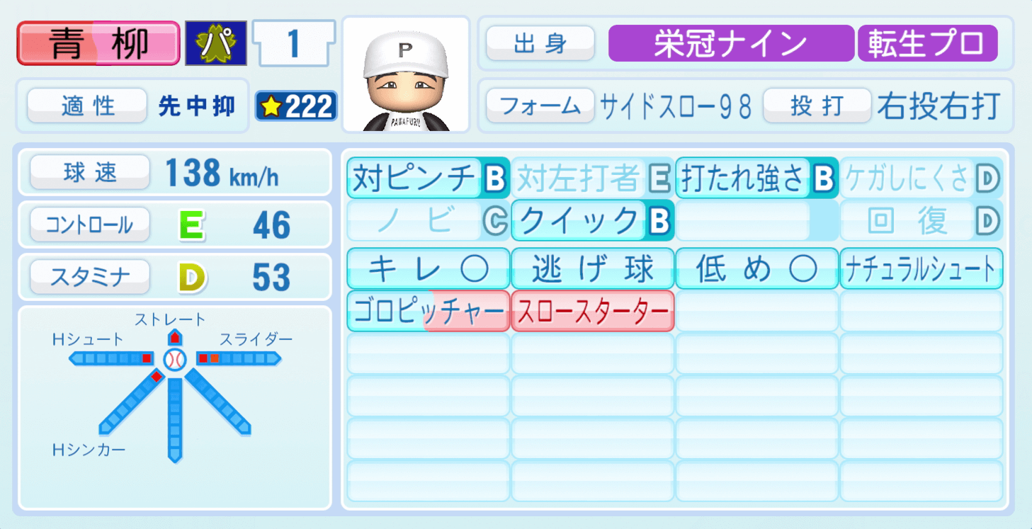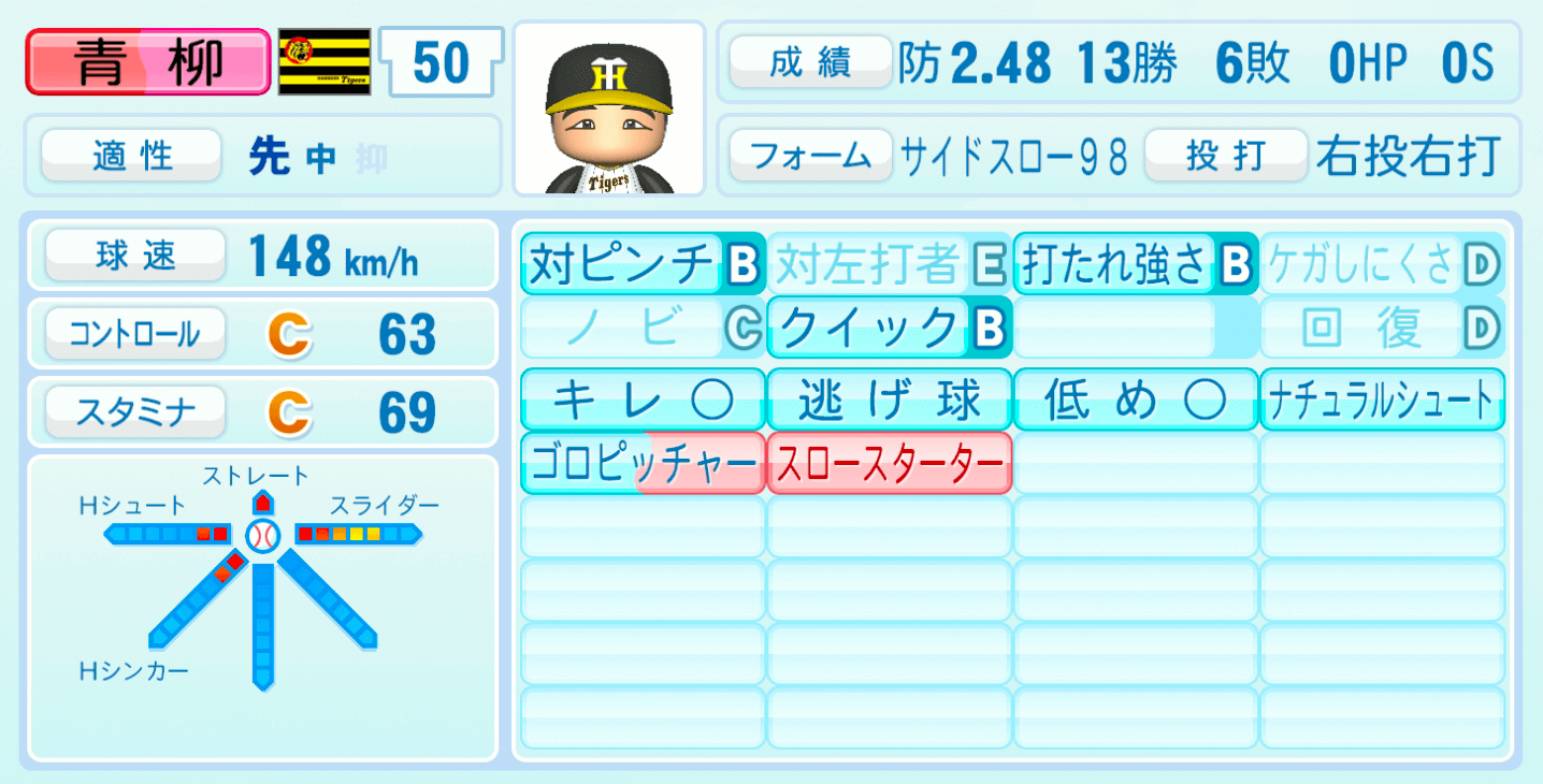 | 適性 | 先/中 | 球速 | 148km/h |