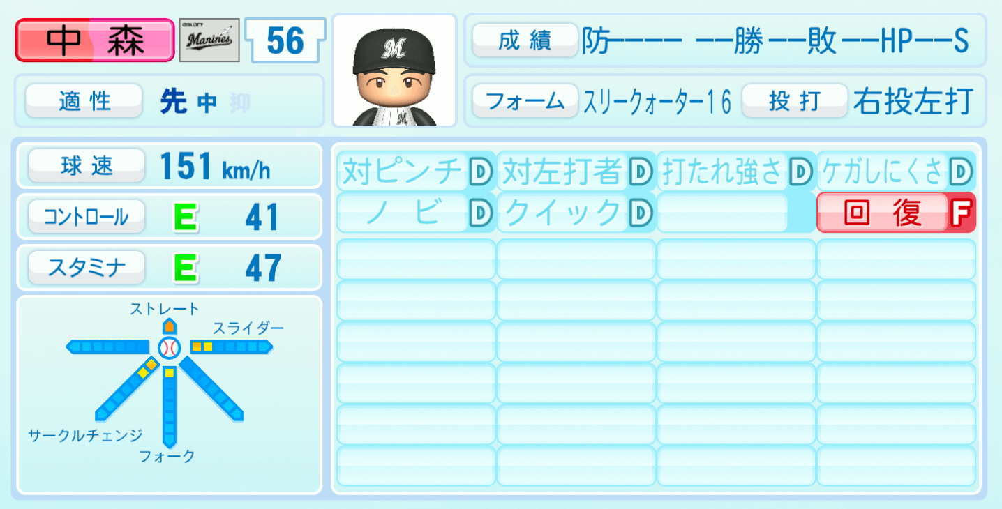 | 適性 | 先/中 | 球速 | 151km/h |