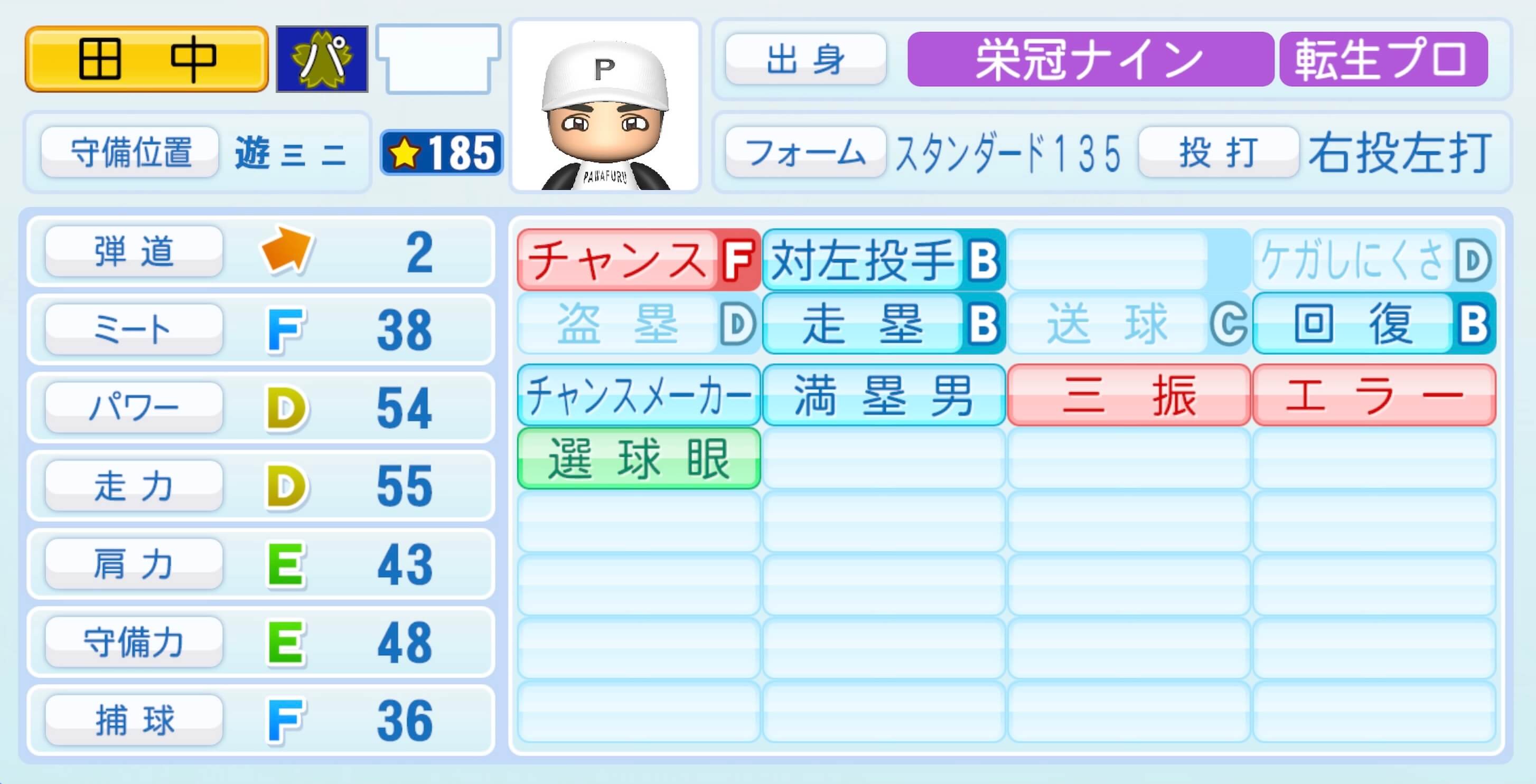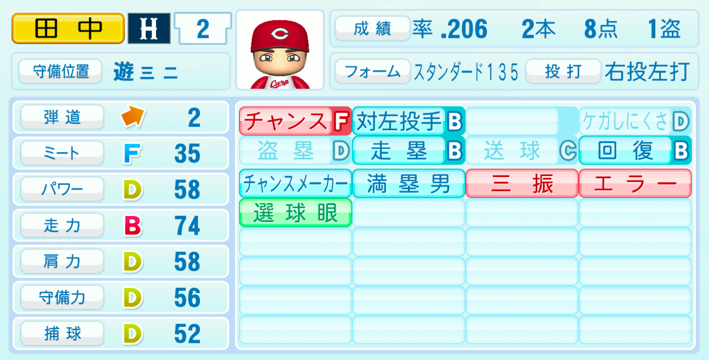| 守備位置 | 弾道 | ミー | パワ | 走力 | 肩力 | 守備 | 捕球 |