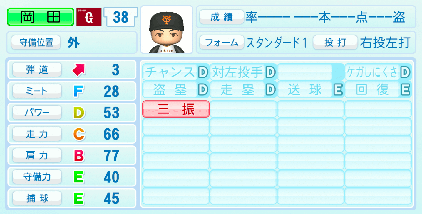 | 守備位置 | 弾道 | ミー | パワ | 走力 | 肩力 | 守備 | 捕球 |