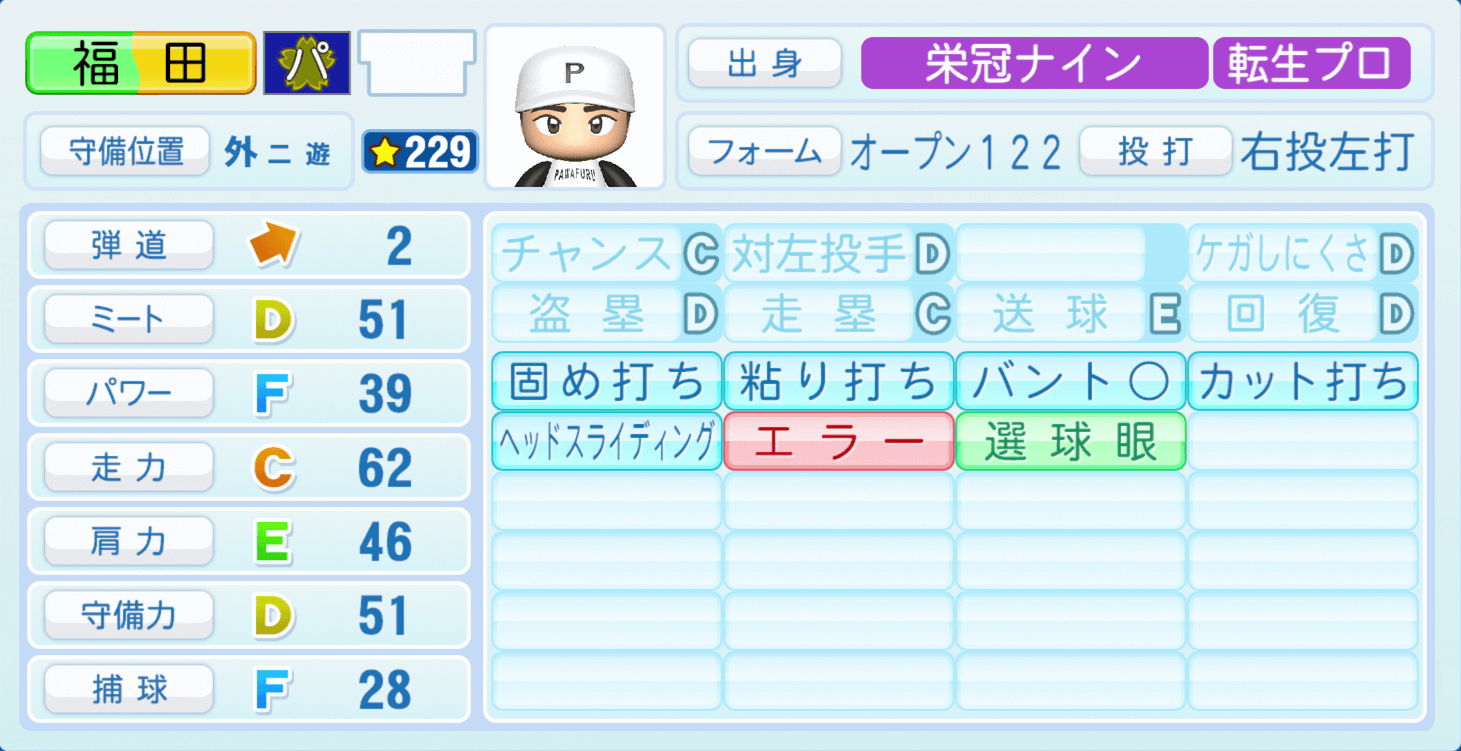 | 守備位置 | 弾道 | ミー | パワ | 走力 | 肩力 | 守備 | 捕球 |