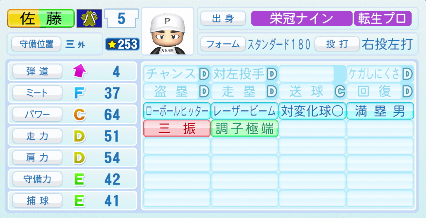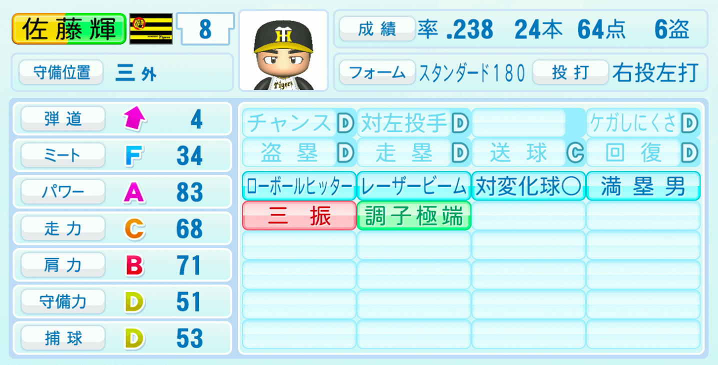 | 守備位置 | 弾道 | ミー | パワ | 走力 | 肩力 | 守備 | 捕球 |