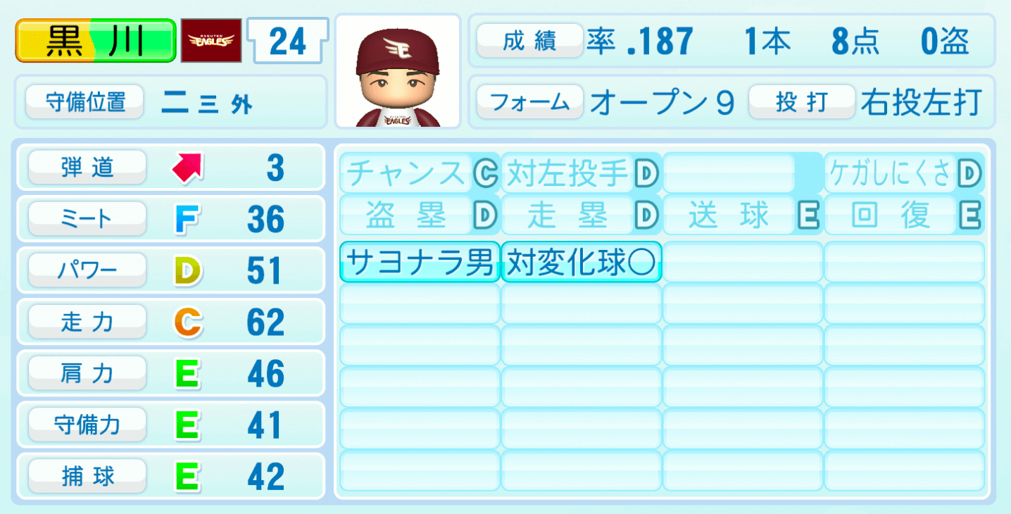 【パワプロ2022】黒川史陽の選手・特殊能力と転生情報|楽天