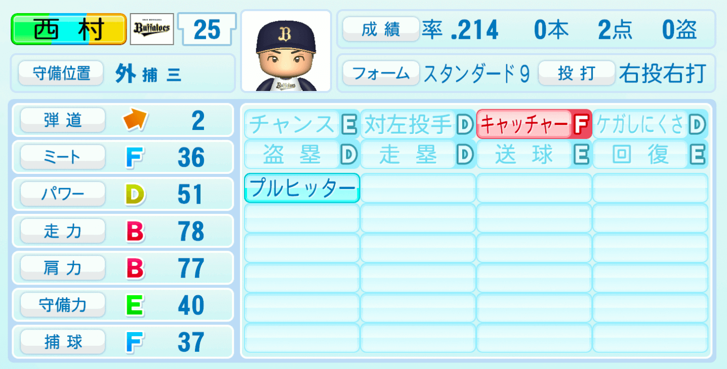 | 守備位置 | 弾道 | ミー | パワ | 走力 | 肩力 | 守備 | 捕球 |