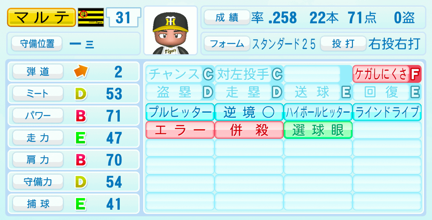 | 守備位置 | 弾道 | ミー | パワ | 走力 | 肩力 | 守備 | 捕球 |
