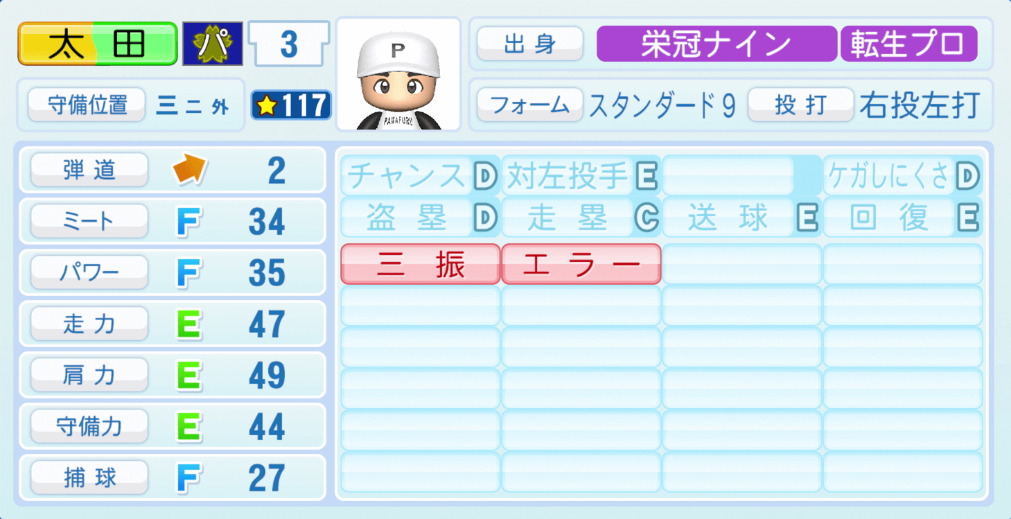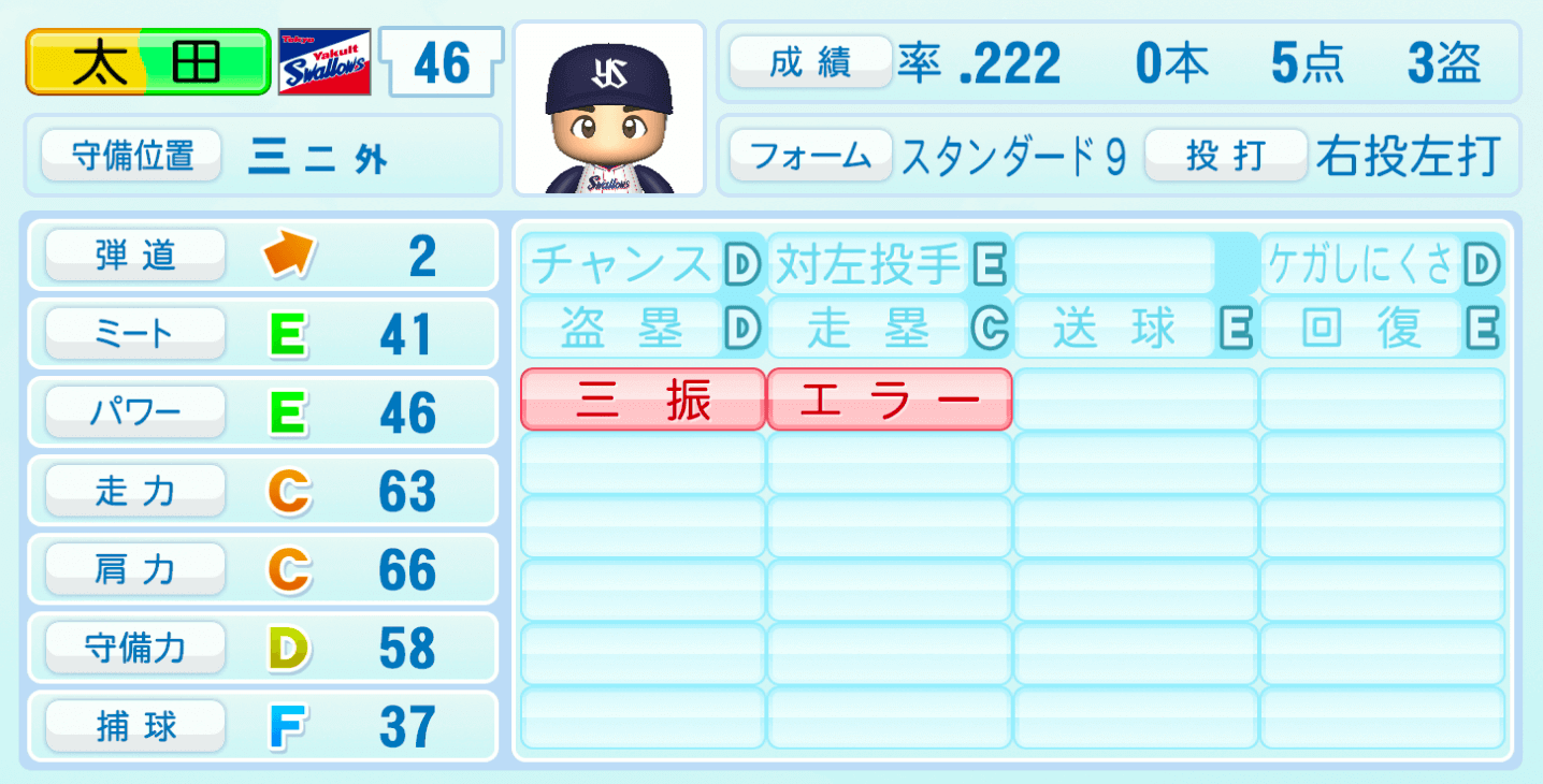 | 守備位置 | 弾道 | ミー | パワ | 走力 | 肩力 | 守備 | 捕球 |