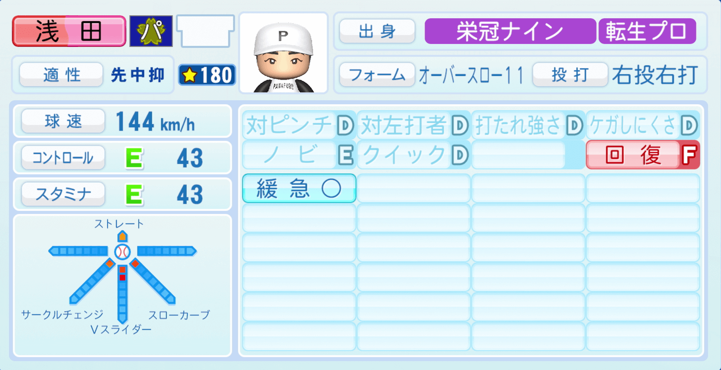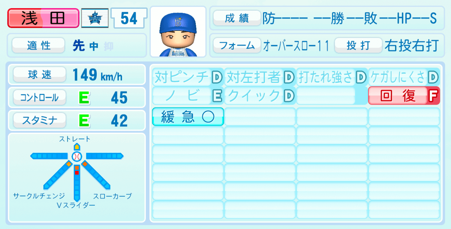 | 適性 | 先/中 | 球速 | 149km/h |