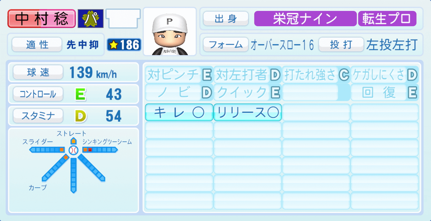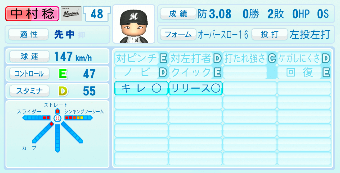 | 適性 | 先中/- | 球速 | 147km/h |