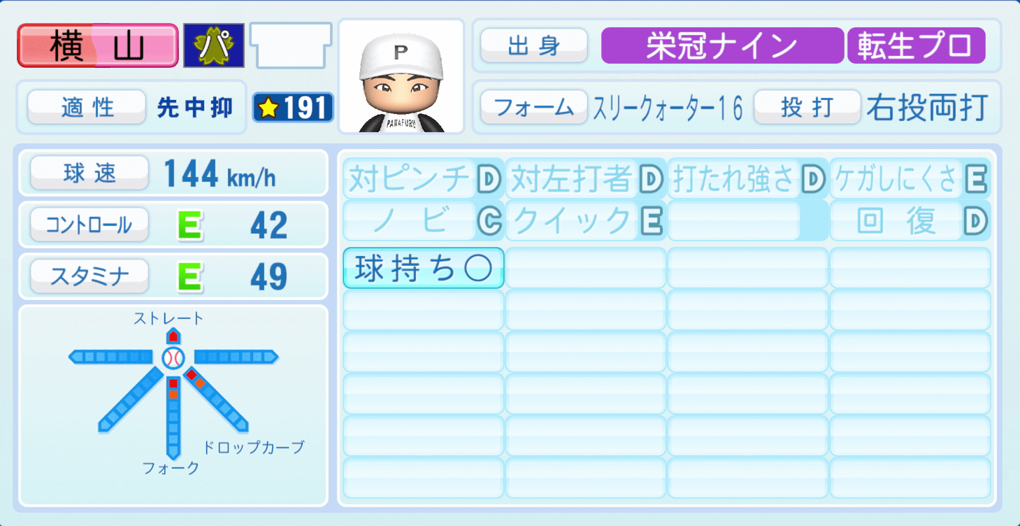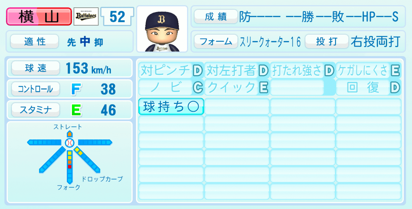 | 適性 | 中/先抑 | 球速 | 153km/h |