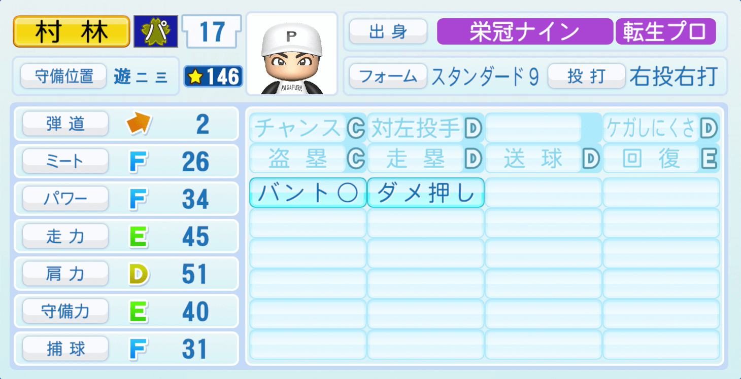 | 守備位置 | 弾道 | ミー | パワ | 走力 | 肩力 | 守備 | 捕球 |