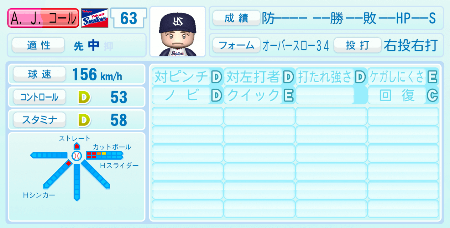 | 適性 | 中/先 | 球速 | 156km/h |