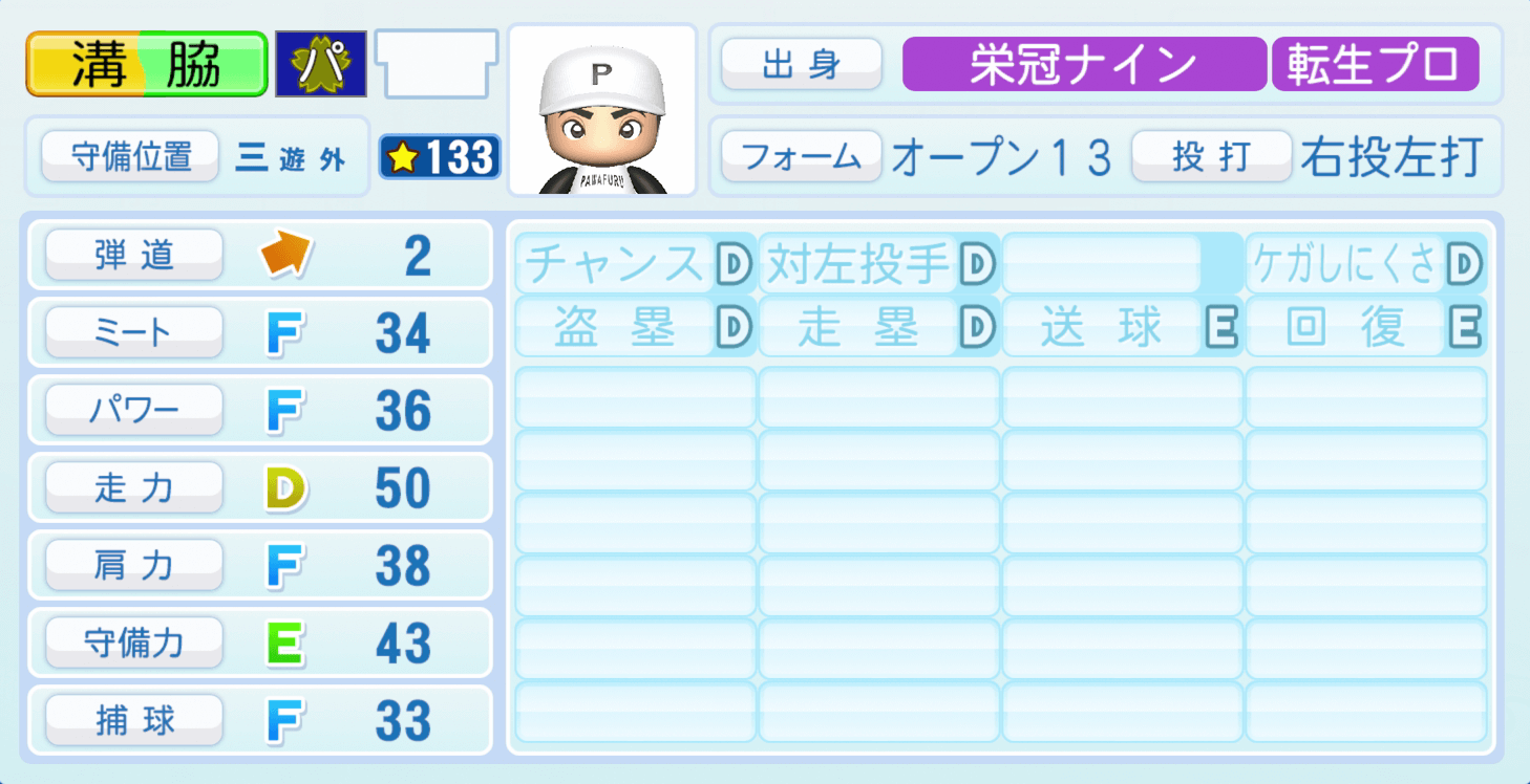 | 守備位置 | 弾道 | ミー | パワ | 走力 | 肩力 | 守備 | 捕球 |