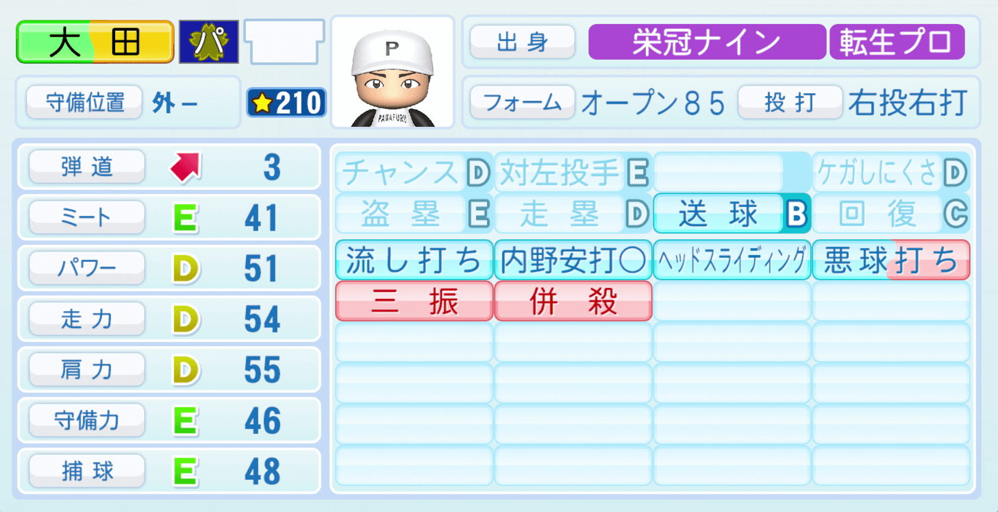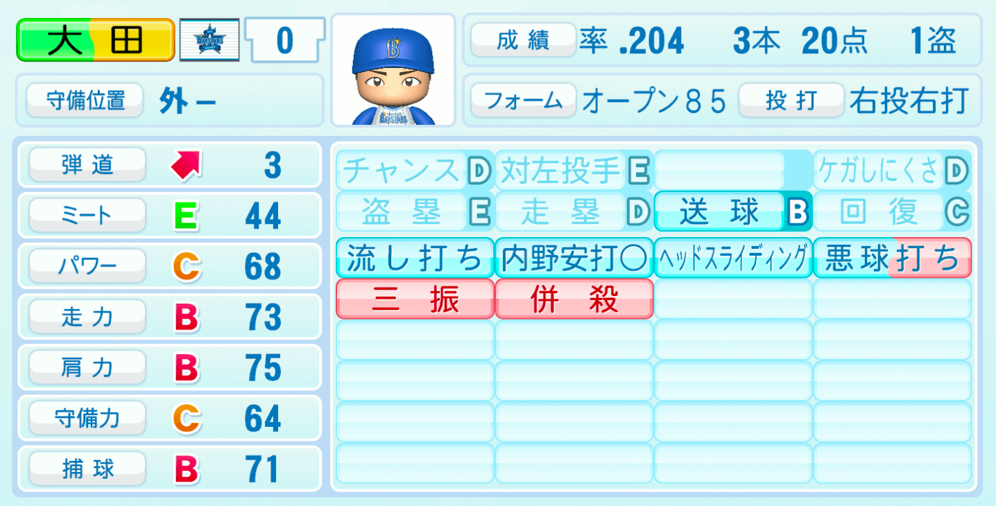 | 守備位置 | 弾道 | ミー | パワ | 走力 | 肩力 | 守備 | 捕球 |