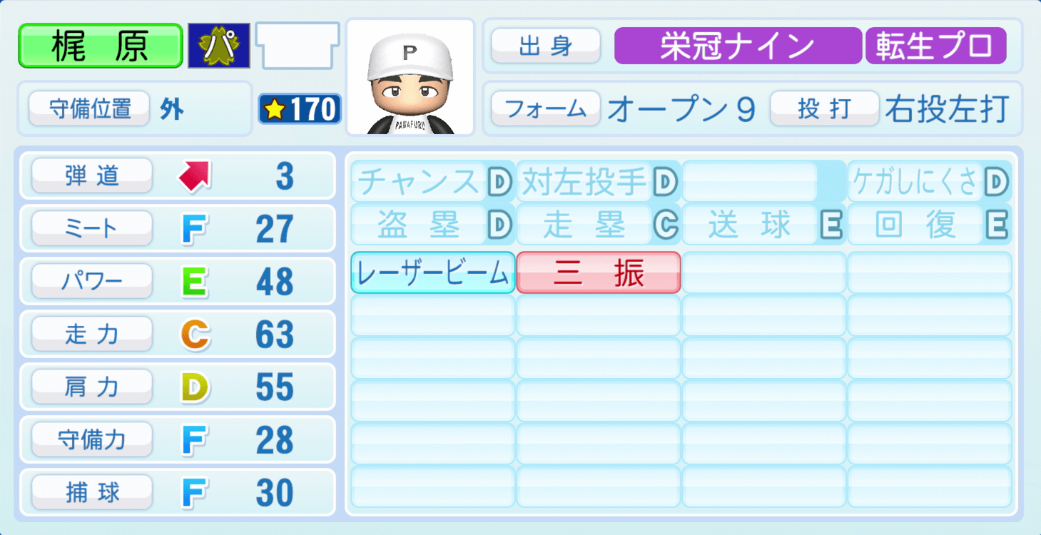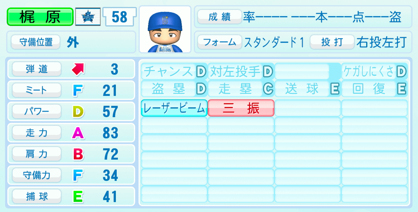 | 守備位置 | 弾道 | ミー | パワ | 走力 | 肩力 | 守備 | 捕球 |