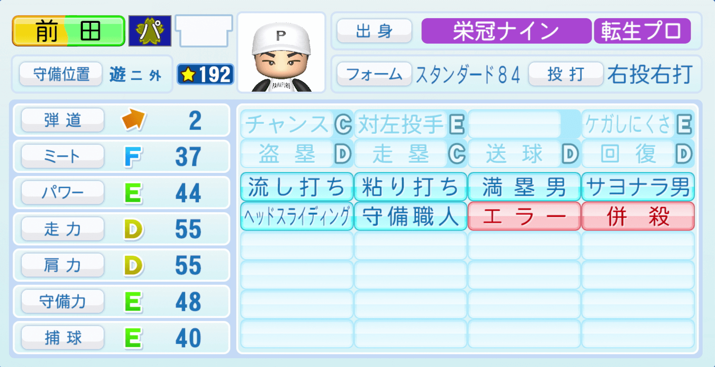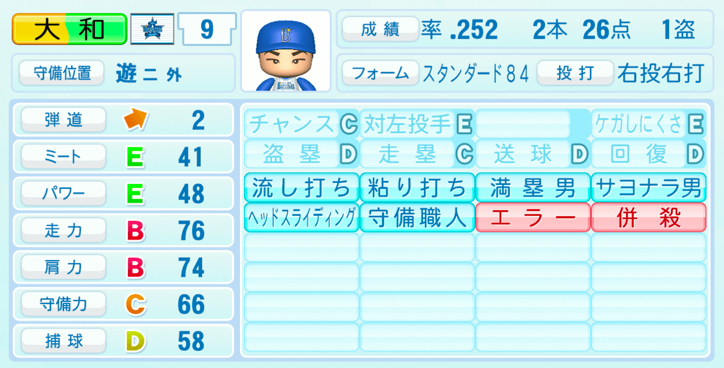 | 守備位置 | 弾道 | ミー | パワ | 走力 | 肩力 | 守備 | 捕球 |