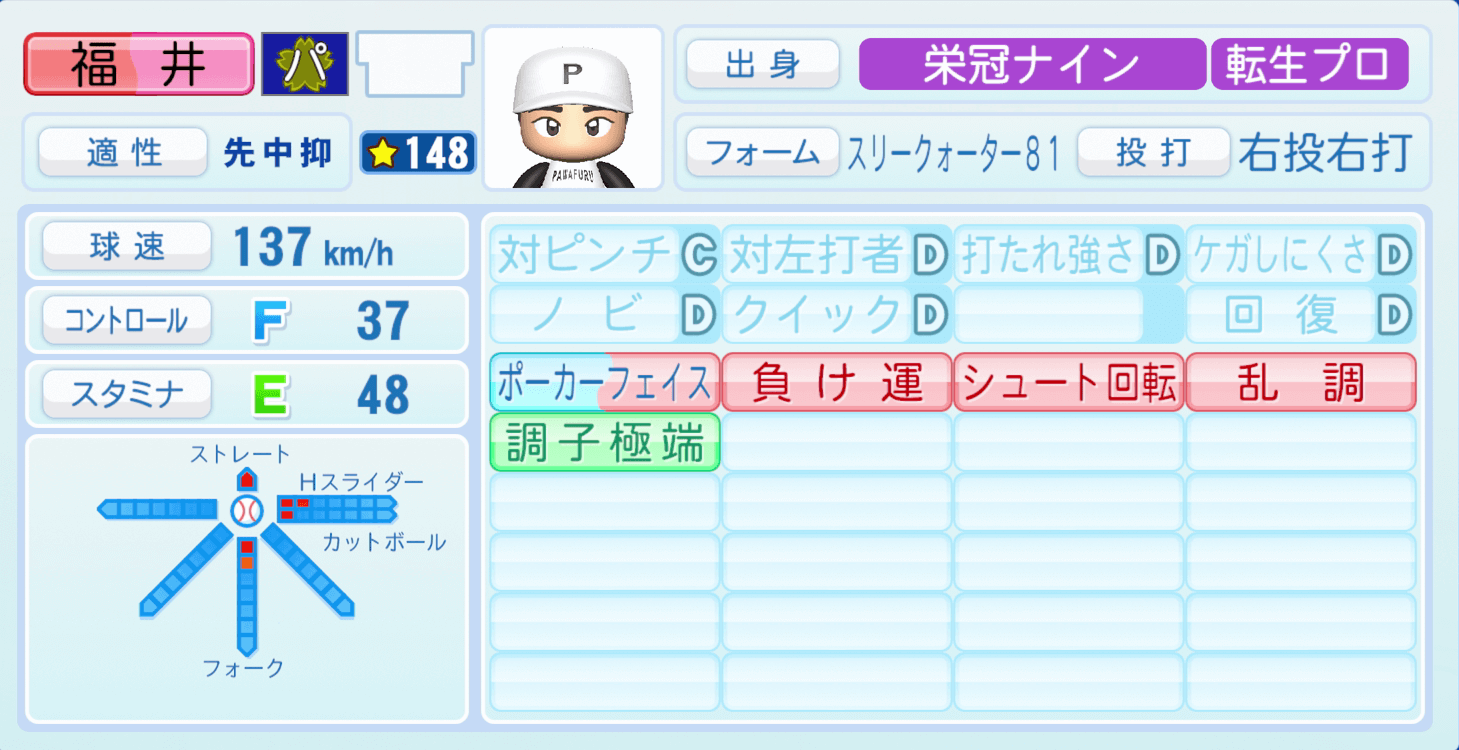 | 適性 | 中/先 | 球速 | 148km/h |