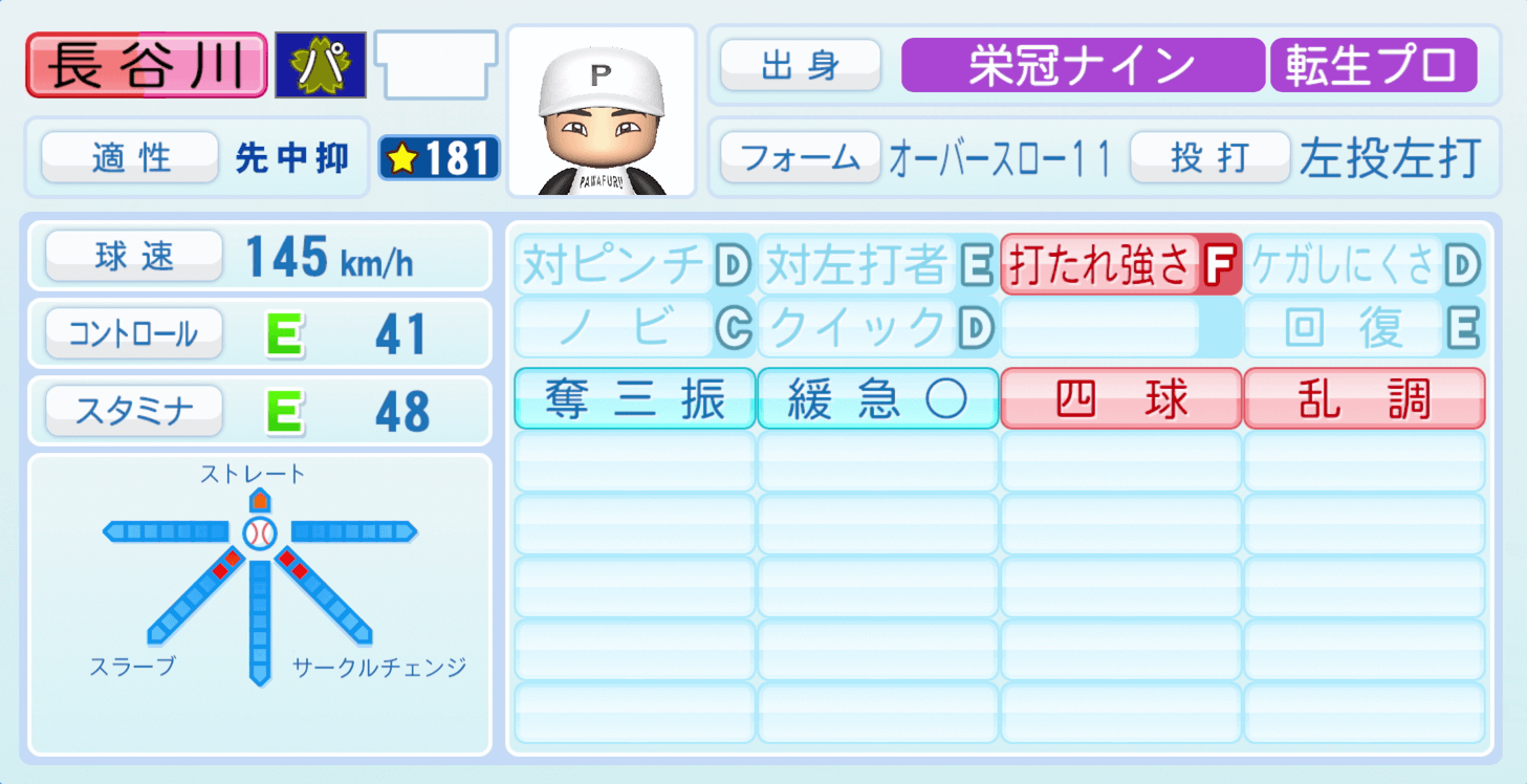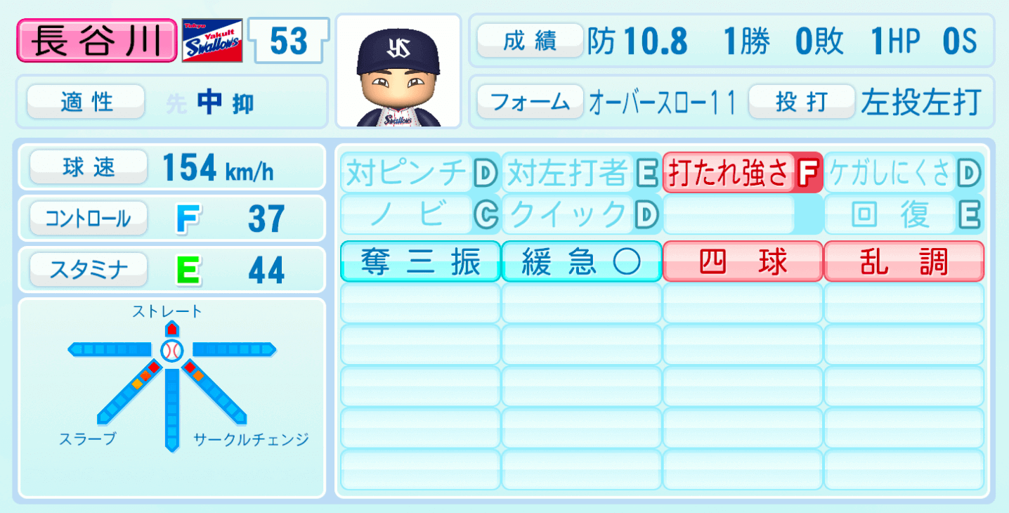| 適性 | 中/抑 | 球速 | 154km/h |