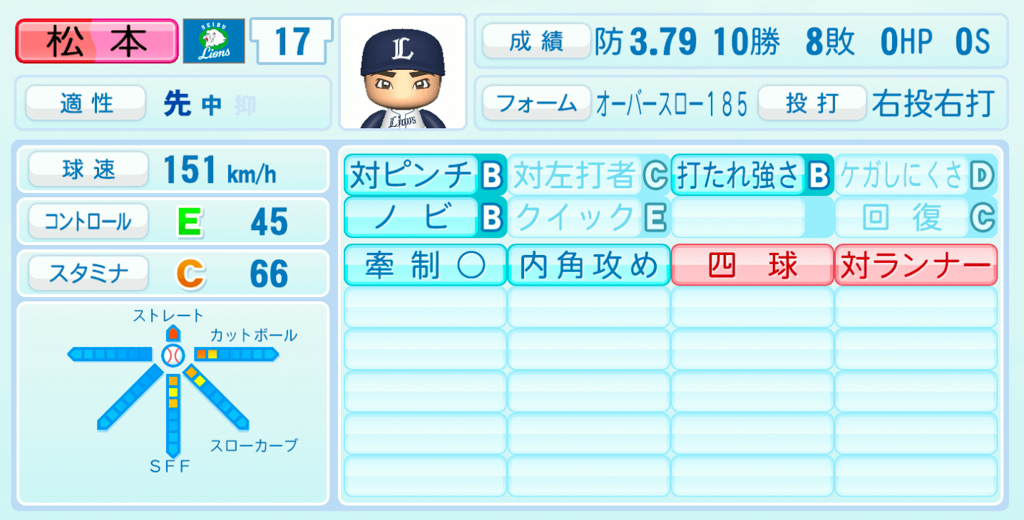 | 適性 | 先/中 | 球速 | 151km/h |