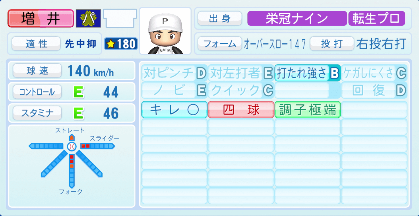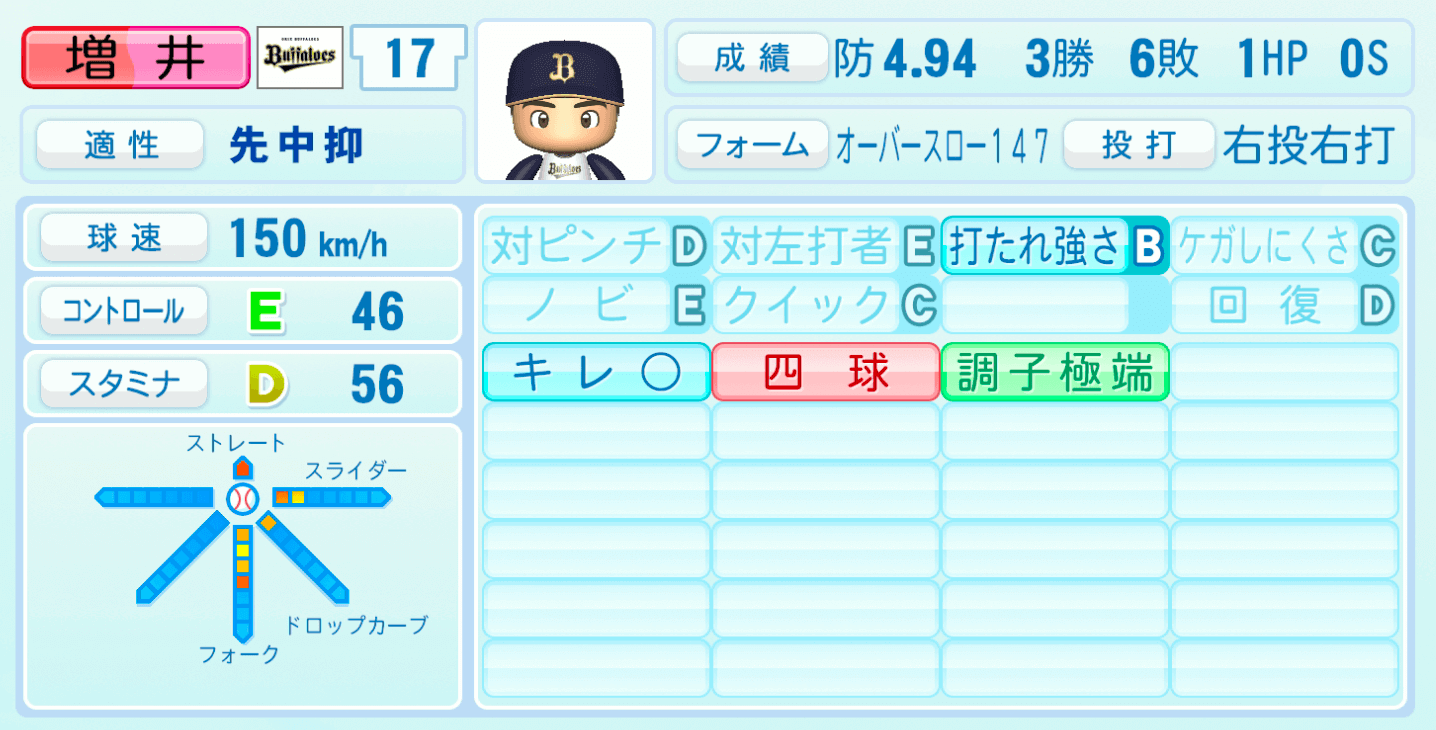 | 適性 | 先中抑/- | 球速 | 150km/h |